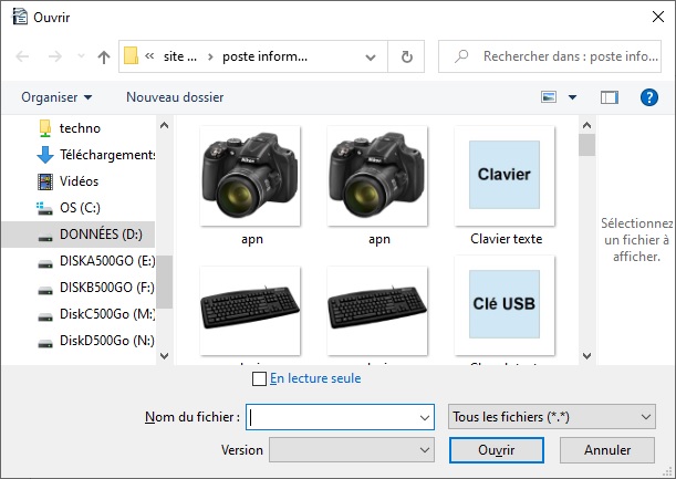 A droite, on voit la fenêtre ouvrir qui apparaît ensuite. Il faudra se promener dans les différents répertoire pour trouver le fichier désiré.