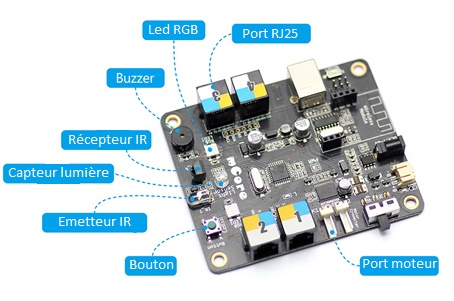 / Robot MBot / Par Laurent Barthès Prise en main du robot Pour des raisons de sécurité, le robot doit toujours se trouver dans sa boite. Carte électronique contenue dans le boitier plastique